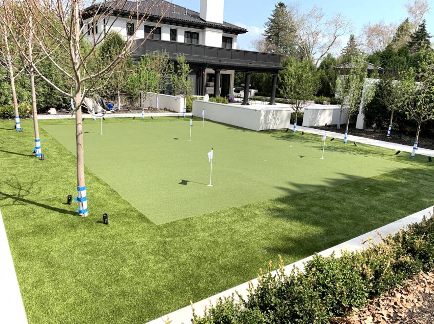 Residential putting green owners usually have greens that range between 300 and 1,800 square feet. There are factors to consider that will affect the size of the green, such as available space in the yard, budget, number of holes and breaks to be incorporated, space for chipping and approach shots, etc. An experienced putting green designer can help create the green to match each unique golfer’s ideas.